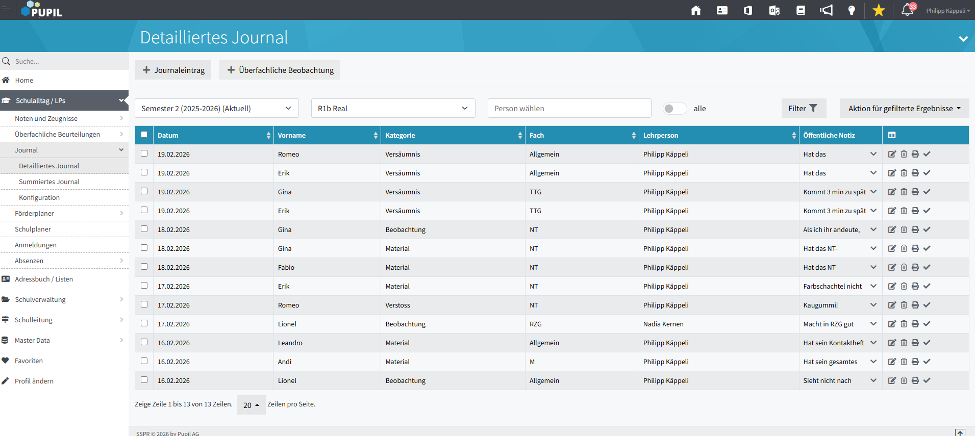 Die Spalten "Datum - Vornamen - Kategorie - Fach - Lehrperson" k�nnten gut halb so breit sein und das was ich an Platz einspare k�nnte dann f�r die Spalte "�ffentliche Notiz" verwendet werden. Diese m�chte ich n�mlich v.a. Sehen!