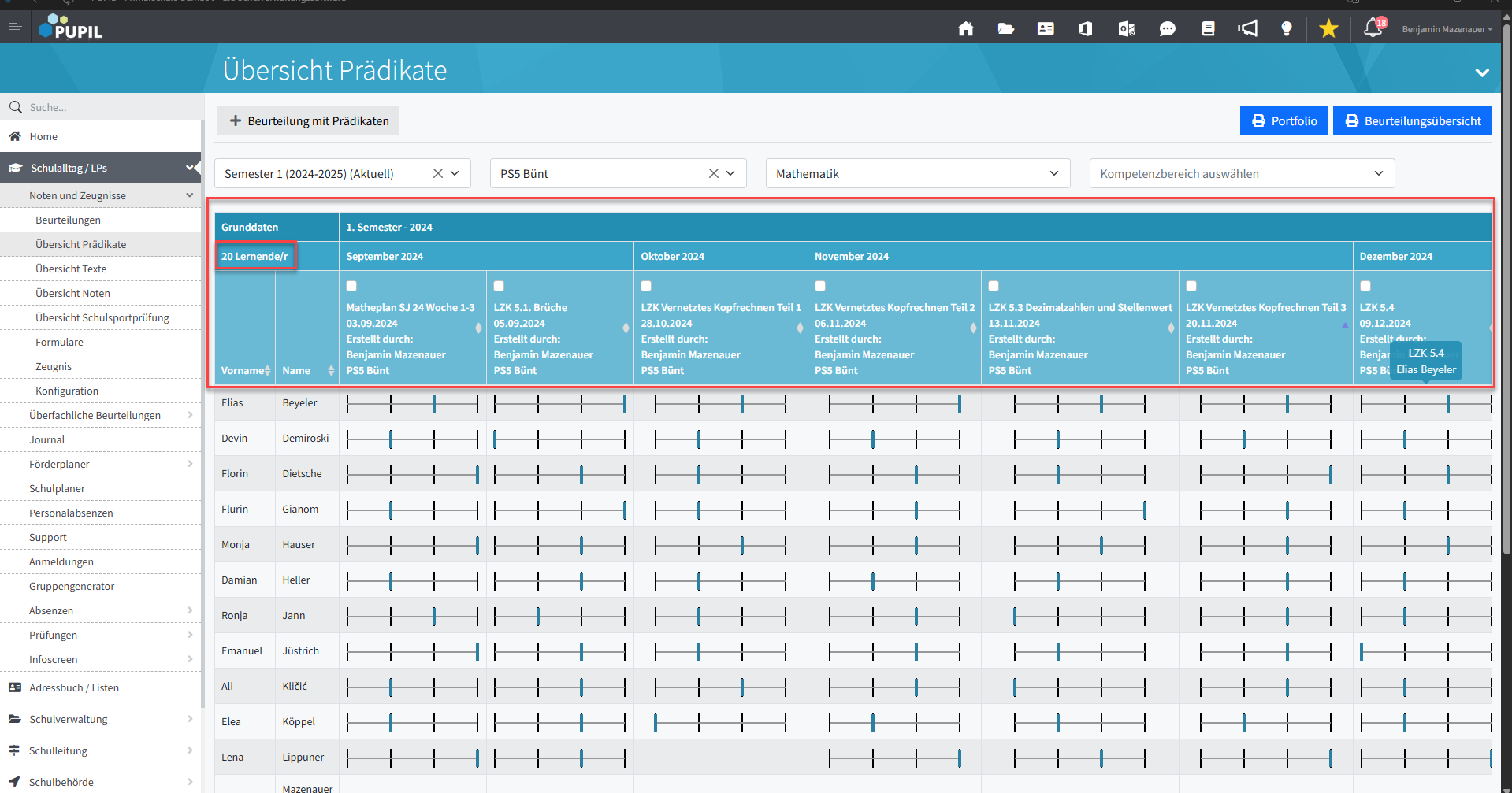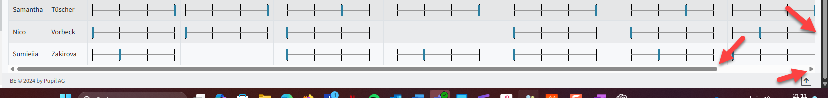 Wir haben ein Anliegen betreffend dem Alltagshandling in der Beurteilungsübersicht. Sobald ich eine grössere Klasse habe und mehr als 5 oder 6 Beurteilungsanlässe erfasst habe, muss ich "immer" scrollen, damit ich dann den Schieber unten nach rechts schieben kann und alle Beurteilungen sehe. Für uns wäre es wünschenswert, wenn so ein Schieber (weiss nicht genau, wie dieses Ding heisst :-)) auch oben angebracht wäre, somit müsste nicht immer zuerst gescrollt werden. Oder eine Option die Beurteilungsfenster kleiner zu machen. So eine Art Zoom Funktion, damit ich auf meinem Fenster alle Beurteilungsanlässe sehen kann.