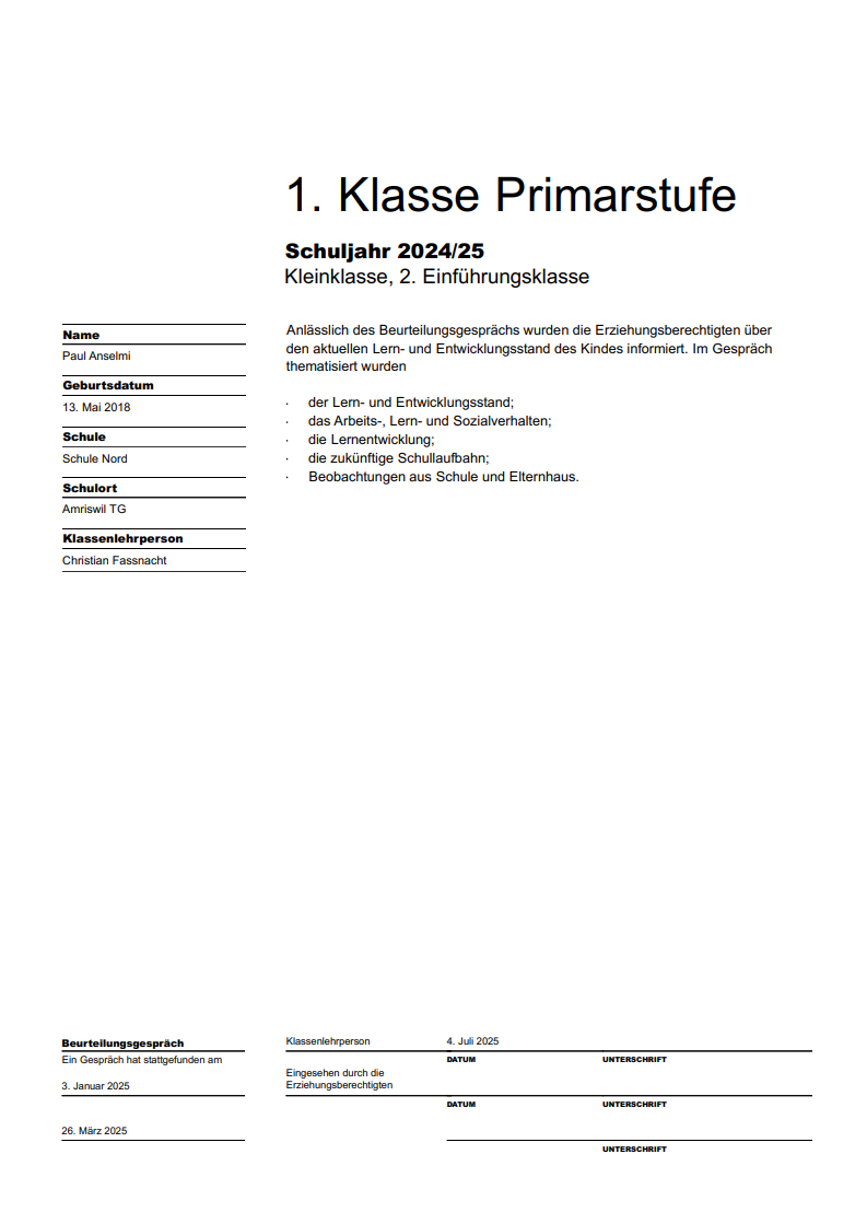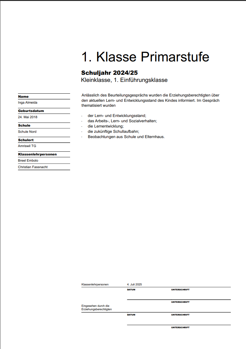 Die Gestaltung der Zeugnisse obliegt dem Amt für Volksschule. In PUPIL werden diese Vorgaben lediglich umgesetzt.